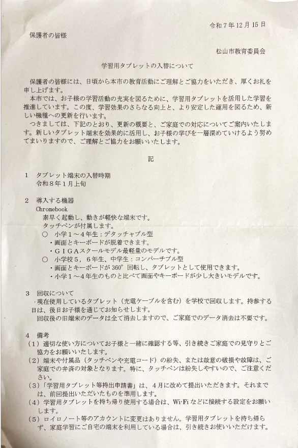 学習用タブレットの入替について