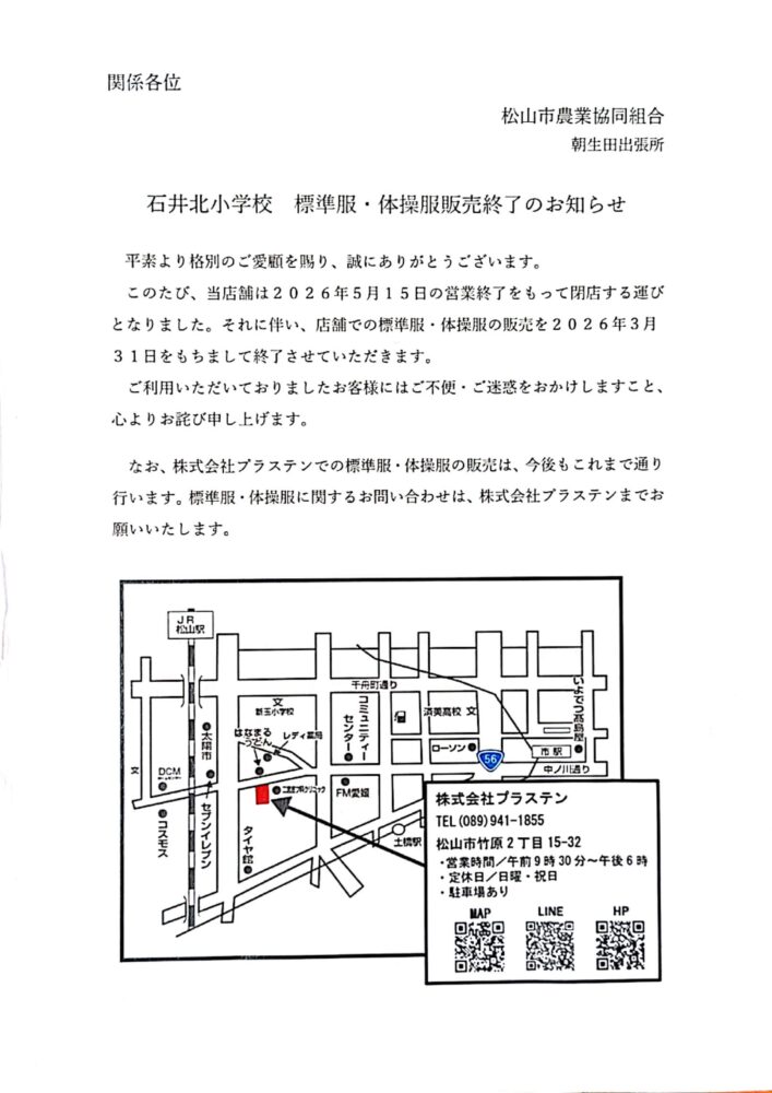 石井北小学校 標準服・体操服販売終了のお知らせ
