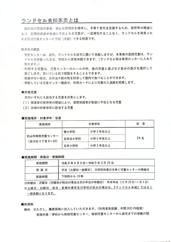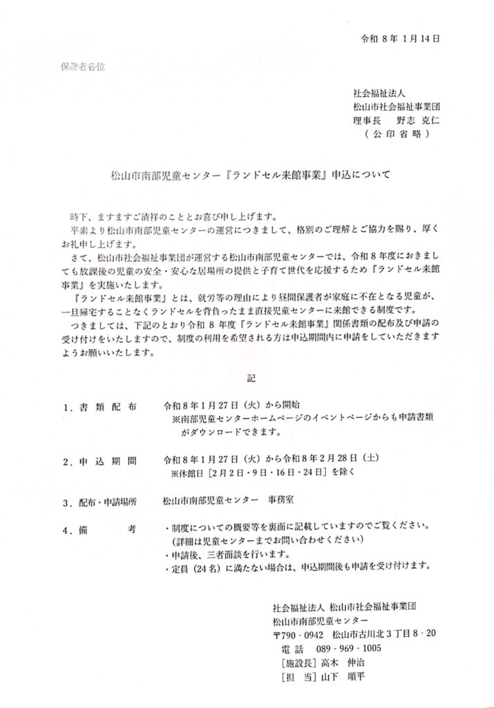 松山市南部児童センター『ランドセル来館事業』 申込について