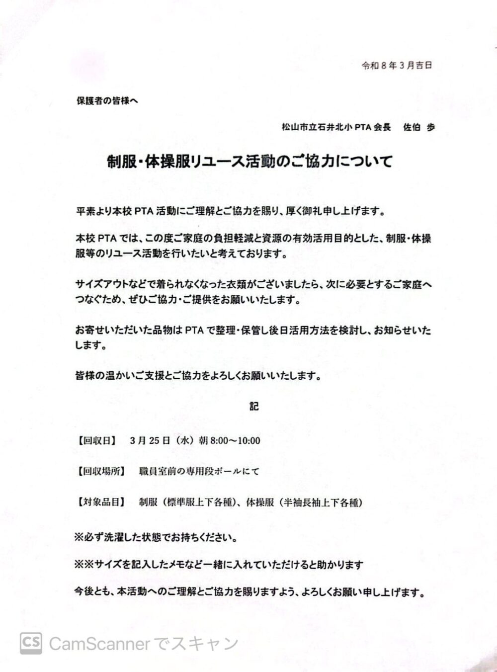 制服・体操服リユース活動のご協力について