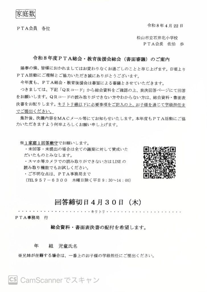 令和8年度PTA総会・教育後援会総会(書面審議)のご案内